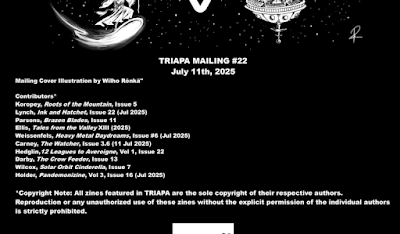 Our 22nd mailing is now available. This one includes 10 contributions plus a gorgeous cover with art by Wilho Rönkä. You can download the free PDF here: TRIAPA Mailing #22 (June 2025)